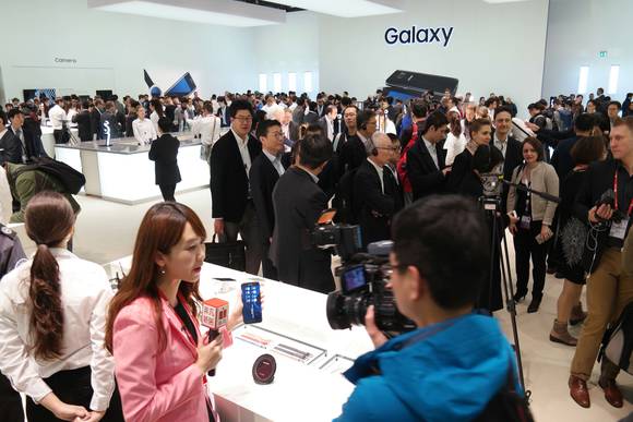 [MWC 2016] 삼성전자 부스에서 ‘갤럭시 S7’과 ‘S7 엣지’를 둘러보는 관람객들