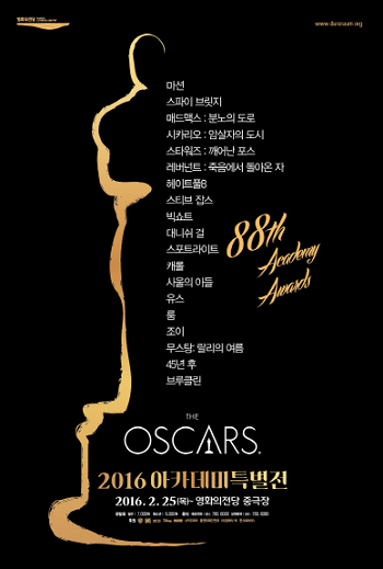 전 세계 영화애호가들의 관심이 오는 2월 28일 개최되는 제88회 미국 아카데미 시상식(OSCAR)에 몰려있는 가운데 영화의전당에서는 그 후보작들을 만나볼 수 있는 '2016 아카데미 특별전'을 오는 25일부터 3월 30일까지 개최한다.