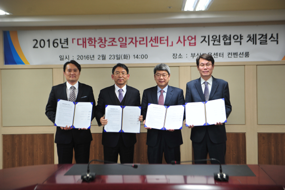 ▲경성대는 23일 오후 부산고용센터에서 부산지방고용노동청 등과 '2016년 대학창조일자리센터' 사업 지원협약 체결식을 가졌다. (사진제공=경성대)