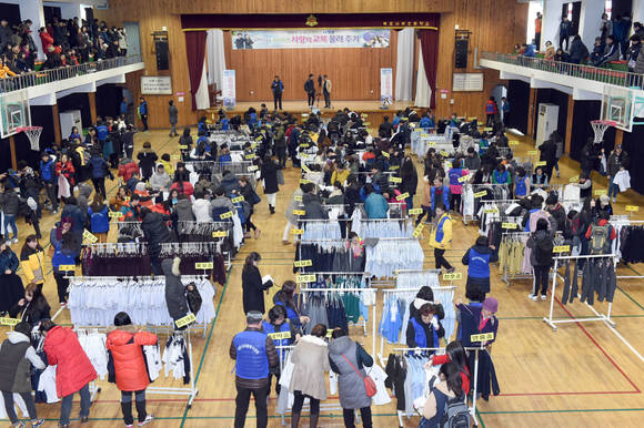 ▲지난 23일부터 25일까지 서부초등학교 체육관에서 열린 '사랑의 교복 물려주기 행사' 모습.