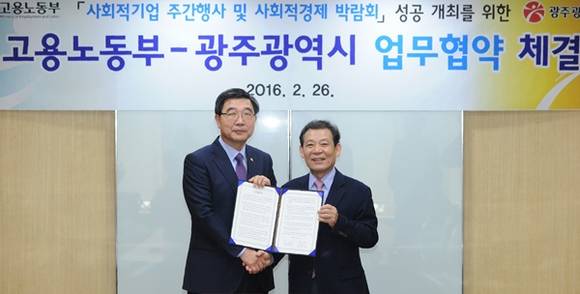 ▲윤장현 광주광역시장은 26일 오전 서울고용노동청에서 이기권 고용노동부장관과 ‘2016 사회적경제 박람회’ 성공 개최 위한 업무협약‘을 체결했다.(사진=광주시)