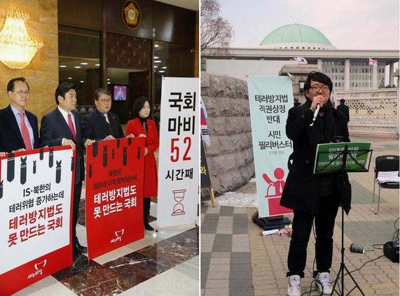 ▲국회 본회의장 입구에서 필리버스터 중단을 요구하며 피켓시위를 벌이고 있는 새누리당 의원들(왼쪽)과 국회 앞에서 열린 ‘테러방지법 반대 시민 필리버스터’에 참여한 녹색당 김수민 대변인. (사진=연합뉴스)
