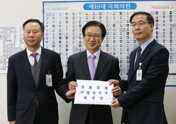 ▲여야가 20대 총선 선거구 획정안에 합의해 국회 통과를 앞두고 있다. 지역구를 7석 늘려 기득권 챙기기라는 비판이 일고 있는 가운데, 이런 분위기를 타고 테러방지법도 함께 통과될 것으로 보는 시각이 많다. 김세환 중앙선거관위 선거구획정위원회 사무국장(오른쪽)이 28일 국회 의장실을 찾아 이명우 의장실 정무수석 비서관(가운데)에게 선거구획정안을 제출하고 있다. (사진=연합뉴스)