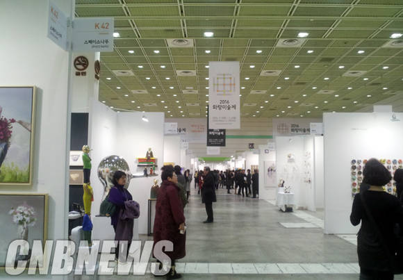 ▲'2016 화랑미술제'를 찾은 관람객들이 작품을 구경하고 있다. 이번 화랑미술제에서는 500여 명의 작가가 2500여 점의 작품을 선보인다.(사진=김금영 기자)