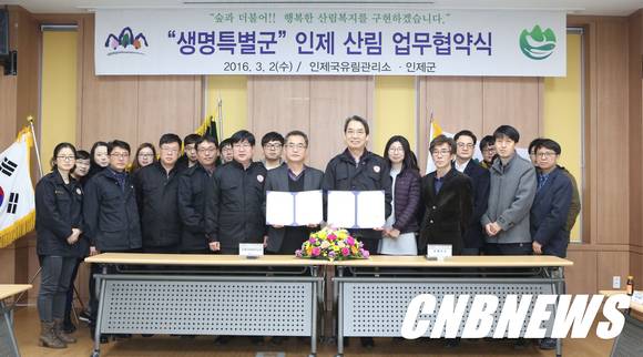 한편 이번 협약은 인제군 전체 산림 면적인 159,177ha의 77.1%가 산림청 소관인 국유림이고 조림을 비롯해 숲 가꾸기, 산사태, 산불 방지 등 산림 사업이 국유림관리소와 연계해 추진됨에 따라 산림 시책 추진에 따른 상호 정보교류, 사전 협조체계 구축 등 공감대 형성을 위해 마련됐다