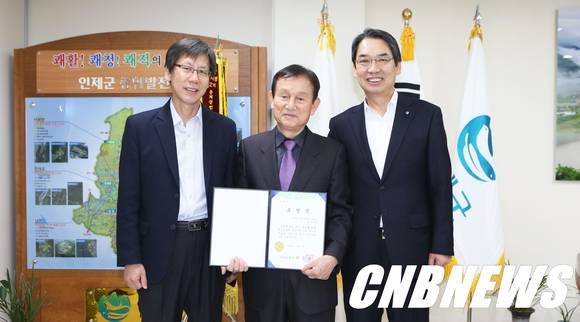 ▲인제군 기린면 박수탁(78·사진 가운데)씨가 3일 인제군수 집무실에서 납세자의 날을 맞아 지방세 성실납부 등 지방세정 발전에 기여한 공으로 이순선 군수에게 도지사 표창을 전달받았다. (사진=인제군청 제공)