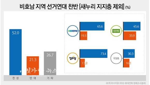 최근 정치권의 가장 핵심 이슈로 등장한 더불어민주당 김종인 비상대책위원회대표의 야권통합 제안과 관련해 새누리당 지지층을 제외한 야권층을 대상으로 “오는 4월 총선과 관련하여 더민주ㆍ국민의당ㆍ정의당 등 야권이 비호남 지역에서 선거연대를 해야 한다는 견해에 대해 어떻게 생각하느냐”는 질문에 ‘찬성(52.0%) vs 반대(21.3%)’로, 찬성 응답이 2.4배인 30.7%p 더 높았다(무응답 : 26.7%).