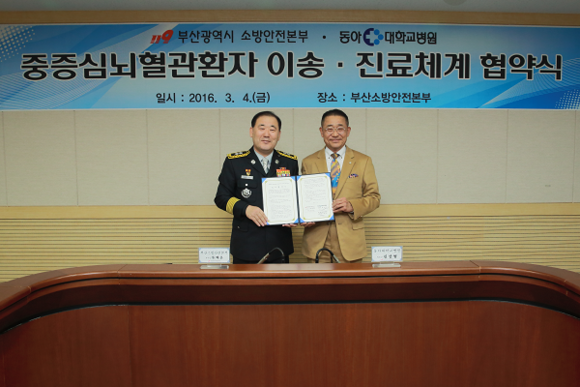 부산소방안전본부(본부장 류해운)는 4일 오후 3층 영상회의실에서 동아대학교병원(병원장 김상범)과 심뇌혈관환자에 대한 이송 및 진료체계 구축을 위한 협약을 체결하고 공동으로 협력해 나가기로 했다.