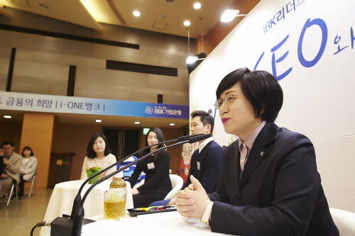 IBK기업은행은 7일 권선주 은행장이 서울 을지로 본점 대강당에서 사내 소통활성화를 위한 영업현장 조직 ‘IBK 리더스 클럽’ 회원 133명과 대화의 시간을 가졌다고 밝혔다.