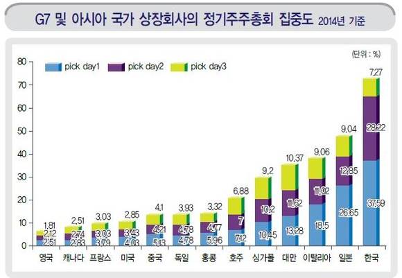 국회 입법조사처 통계에 따르면, 우리나라는 한날한시에 주주총회가 열리는 ‘날짜 집중도’가 G7 및 아시아 주요국가 중 가장 높다.
