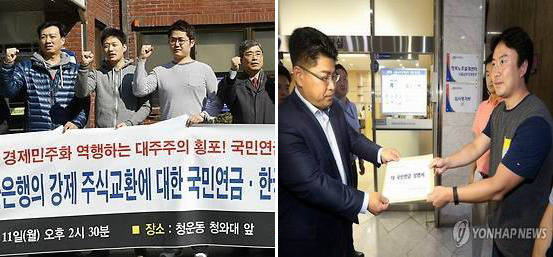 ▲금요일 슈퍼주총, 거수기 투표 등에 막힌 소액주주들의 주주권을 되살려야 한다는 지적이 일고 있다. ‘경제민주화와 재벌개혁을 위한 국민운동본부’ 회원들이 최근 국민연금 등의 공익적 행동을 촉구하는 집회를 열고 있다(왼쪽). 지난해 7월 삼성물산-제일모직 합병 당시 합병에 반대하는 소액주주들이 합병 반대 성명서를 주요주주인 국민연금 측에 전달하고 있다. (사진=연합뉴스)