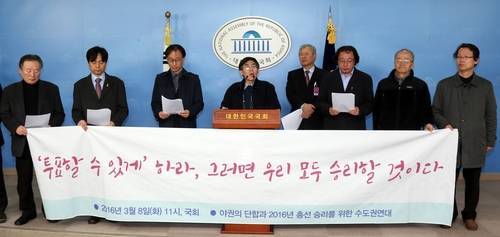 ▲'야권의 단합과 2016 총선승리를 위한 수도권연대' 회원들이 8일 오전 국회 정론관에서 발족 기자회견을 열고 "이번 4.13 총선에서 적어도 수도권에서의 야권연대를 반드시 실현하라"고 요청하고 있다. 수도권연대는 한완상 전 부총리와 함세웅 민주주의국민행동 상임대표, 최병일 경기시민사회단체연대회의 상임대표, 정세일 인천시민의힘 운영위원장 등이 참여한다.(사진=연합뉴스)