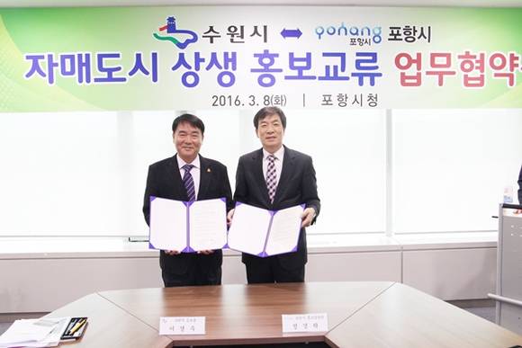 수원시가 8일 포항시청 세미나실에서 포항시와 자매도시 홍보교류 업무 협약을 체결했다.