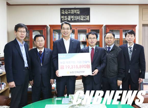 ▲농협인제군지부(지부장 최선식)는 지난 7일 인제군청을 방문해 2015년도 인제군청 제휴카드 기금 1931만5890원을 전달했다. (사진=인제군청 제공)