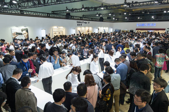 ▲갤럭시 S7·S7 엣지 공개 행사에 참석한 중국 미디어와 거래선이 제품을 체험하고 있다. (사진제공=삼성전자)