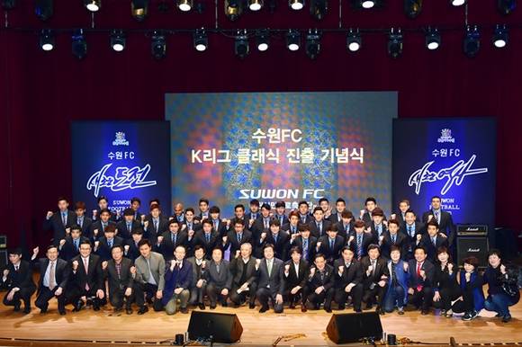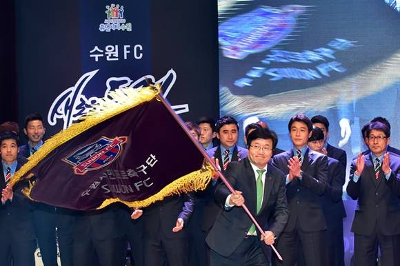 수원FC는 지난 8일 구단주인 염태영 수원시장과 김춘호 수원FC 이사장을 비롯해 성인팀 및 유소년 선수단, 서포터스, 축구 관계자 등이 참석한 가운데 리그 진출 기념식을 개최하고 클래식 진출을 맞아 새롭게 리뉴얼된 엠블럼과 마스코트, 유니폼 등을 공개했다.