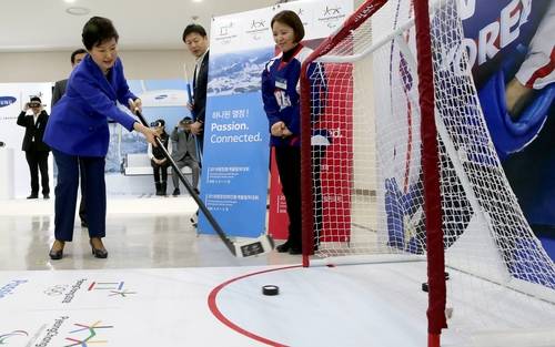박근혜 대통령이 10일 대구육상진흥센터에서 열린 스포츠 문화산업 비전보고대회를 마치고 아이스하키 체험을 하고 있다.