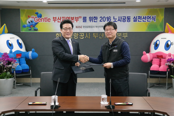 한국공항공사 부산지역본부(본부장 박순천)는 10일 본부 대회의실에서 노사공동대표 및 전 직원이 참석한 가운데 'Gentle 김해국제공항'을 만들기 위한 노사공동 실천 선언식을 개최했다.