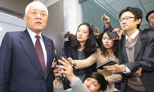 ▲국민의당 김한길 상임 공동선거대책위원장이 11일 오전 국회 의원회관 의원실을 나서며 기자들의 질문에 답하고 있다.(사진=연합뉴스)