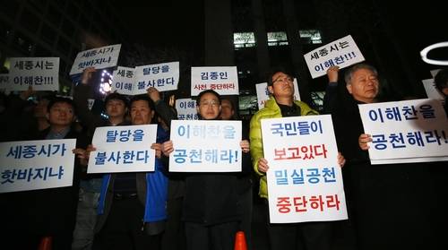 ▲더민주 세종시당 소속 세종시 시의원들과 상무위원, 더불어민주당 이해찬 의원 지지자 등이 13일 밤 서울 여의도 더민주당사 앞에서 이 의원의 컷오프(공천 배제)에 반대하며 집회를 하고 있다.(사진=연합뉴스)