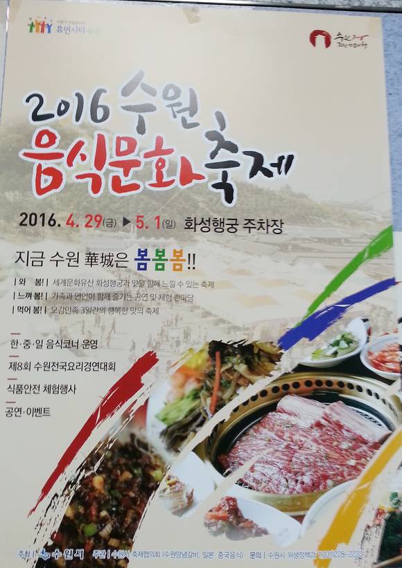 수원시가 오는 4월29일부터 5월1일까지 정조대왕의 정기가 깃든 화성행궁 옆 주차장에서 2016수원음식문화축제를 개최할 예정이다.