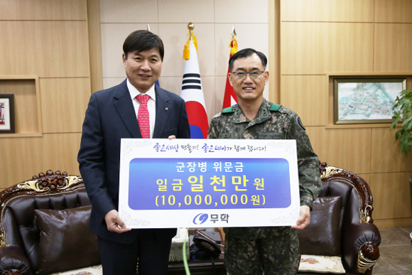 종합주류기업 무학(회장 최재호)은 16일 자매결연 군부대인 육군 제39보병사단(소장 문병호)을 방문해 위문금 1000만 원을 전달했다.