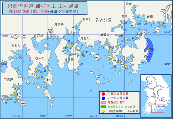16일 국립수산과학원에 따르면, 현재 진해만·통영일원·거제시 동부 연안에 대한 패류독소 조사 결과, 거제시 동부 연안(시방·능포·장승포·지세포)의 진주담치에서 100g 당 45∼77㎍이 검출됐다.
