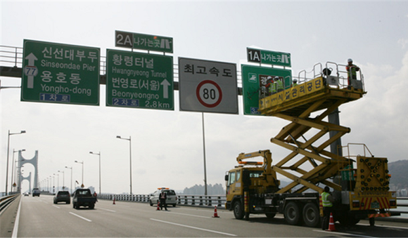 23일 오후 3시부터 광안대로에서 바다로부터 105m 높이에 설치돼 있는 주탑의 '하얀색'을 되찾을 '고압분사' 물청소가 이뤄질 예정이다. 또한 겨울철 눈·비·매연 등으로 더럽혀진 광안대교의 도로·교통안전표지판 440여개, 교량 배수구 1306개, 차선규제봉 등 도로안전시설 4종 190개, 가로등, 톨게이트 등 주요시설들에 대한 대대적인 청소도 함께 진행한다.