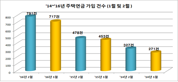 최근 3년간 주택연금 1월과 2월 신규 가입자 현황을 살펴보면 ▲`14년도 598건 ▲`15년도 931건 ▲올해 1508건으로 주택연금 신규 가입자가 지속적으로 증가하고 있다.