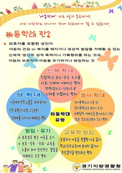 경기지방경찰청은 최근 아동학대 사건이 연이어 발생함에 따라 신학기 도내 초등학교(1청 884개교) 학부모 대상으로 아동학대 근절 및 예방에 관한 교육 및 홍보를 강화한다.