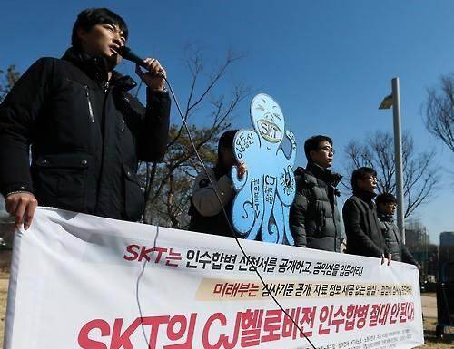 ▲정부의 SK텔레콤-CJ헬로비전 인수합병 승인 심사가 초읽기에 들어간 가운데, 방송 공정성 등을 우려하는 시민단체들의 승인 반대 목소리가 높아지고 있다. 미래부 주최로 SK텔레콤-CJ헬로비전 인수합병 관련 공청회가 열린 지난달 24일, 방송통신실천행동 회원들이 공청회장 밖에서 인수합병 반대 구호를 외치고 있다. (사진=연합뉴스)