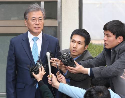 ▲더불어민주당 문재인 전 대표가 김종인 비상대책위원회 대표와 면담을 마치고 22일 서울 구기동 김 대표 자택을 나서며 취재진 질문에 답하고 있다. (사진=연합뉴스0