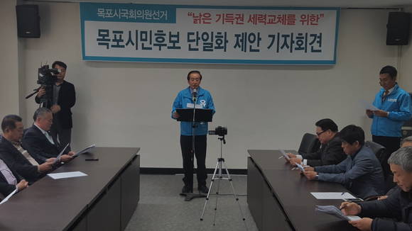 ▲유선호 목포 예비후보는 22일 목포시의회 사랑의 방에서 긴급기자회견을 갖고 시민후보 간 단일화를 통해 시민주권정치를 실현하자고 공식 제안했다.
