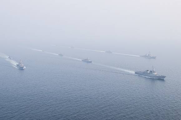 ▲한국형 이지스구축함 세종대왕함(DDG, 7600톤)을 선두로 美 15전대 소속 미 이지스구축함(DDG) Fitgerald, Benfold, 최신예 호위함 경기함(FFG, 2500톤), 호위함(FF, 1500톤), 초계함(PCC, 1000톤, 유도탄 고속함(PKG, 400톤)이 뒤이어 기동하며 해상기동훈련을 실시하고 있다.(사진=해군2함대사령부)