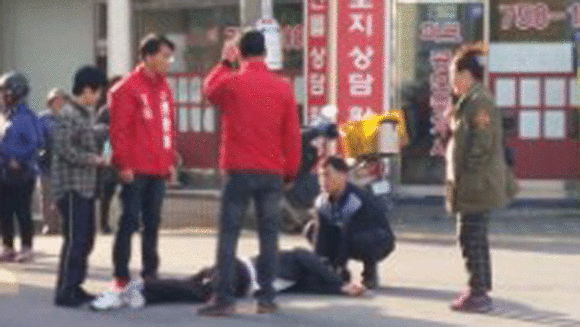 ▲쓰러진 사람에게 심폐소생술을 실시하려고 준비하고 있는 모습. (사진=변환봉 후보측)