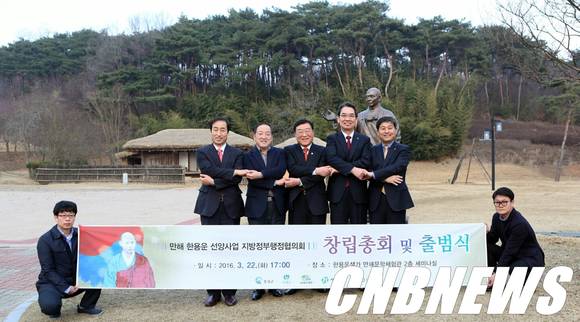 ▲만해 한용운 선양사업 지방정부협의회가 22일 충남 홍성군 만해생가지에서 이순선 인제군수, 이병선 속초시장, 김영배 성북구청장, 문석진 서대문구청장, 김석환 홍성군수가 참석한 가운데 공식 출범했다. (사진=왼쪽부터 문석진 서대문구청장, 이병선 속초시장, 김석환 홍성군수, 이순선 인제군수, 김영배 성북구청장/인제군청 제공)