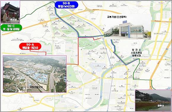 출,퇴근 노선인 90-A번이 월요일부터 금요일까지는 오산대역 –가장산업단지 구간을 운행하고 낮 시간에는 생활형으로 90-B번이 세교신도시-문화예술회관-보건소-스포츠센터-재래시장-오산역-구간을 운행하게 되며 주말인 토,일요일에는 래져형으로 90-C번이 독산성과 – 마등산 구간인 여가·휴게형으로 운행하게 된다.