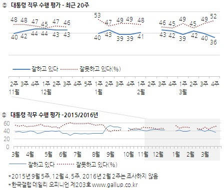 여론조사 전문기관인 한국갤럽이 22~24일 전국 남녀 유권자 1004명을 상대로 휴대전화 인터뷰 조사를 해 25일 발표한 결과(신뢰수준 95%, 표본오차 ±3.1%p)에 따르면 박 대통령의 직무 수행에 대해 '잘하고 있다'고 평가한 응답자는 지난주보다 4%포인트 떨어진 36%로 집계됐고, ‘잘못하고 있다'는 답변은 전주보다 3% 올라간 52%를 기록했다. 13%는 답변을 유보했다.