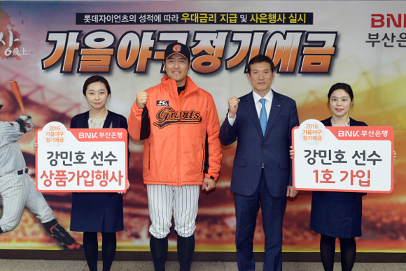 한편 지난 3월 24일 오후에는 롯데 자이언츠 강민호 선수가 부산은행 사직운동장지점을 방문해 '2016년 가을야구 정기예금'에 1호로 가입했다.
