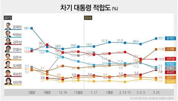 반면, 2위이던 새누리당 김 대표는 0.2%p 떨어진 12.9%를 기록하며 3위로 밀려났고 2위는 전주보다 5.8%p나 급등한 17.8%로 오 전 서울시장이 차지했으며, 이어 박원순 서울시장이 9.0%4위를 차지한 반면, 국민의당 안철수 상임공동대표는 전주보다 3.3%p 급락한 8.1%를 기록하며 5위로 밀려났다. 특히 2.4%p 상승한 7.8%6위를 차지한 유승민 의원이 급상승해 안 대표의 턱밑까지 바짝 따라 붙은 것으로 조사됐다.