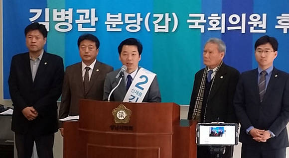 ▲더불어민주당 분당갑 김병관 후보가 시의원들과 함께 기자 간담회를 개최하고 있다. (사진=오익호 기자)