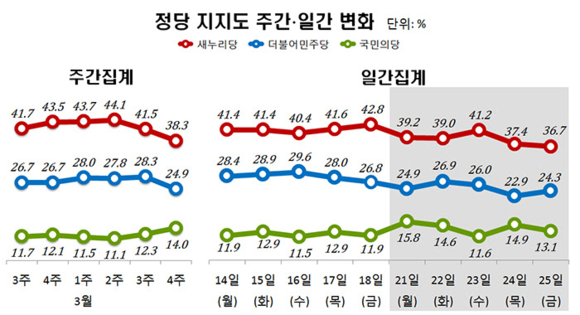여론조사전문기관인 리얼미터가 28일 발표한 지난 21∼25일 전국의 19세 이상 유권자 2522명을 대상으로 실시한 조사(신뢰도 95%, 표본오차 ±2.0%포인트)에 따르면, 이 기간 새누리당의 정당지지도는 38.3%로 전주보다 3.2%p 하락했으며, 더민주도 전주보다 3.4%p 하락한 24.9%를 나타났다.