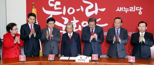 ▲새누리당은 8일 오후 국회에서 지역구와 비례대표 공천 대상자들이 한 자리에 모인 가운데 최근 영입된 강봉균 위원장을 비롯한 김무성 대표, 원유철 원내대표, 서청원·이인제 최고위원의 5인 공동위원장 체제로 구성된 선거대책위원회 발족식을 겸한 공천자대회를 개최한다.(사진=연합뉴스)
