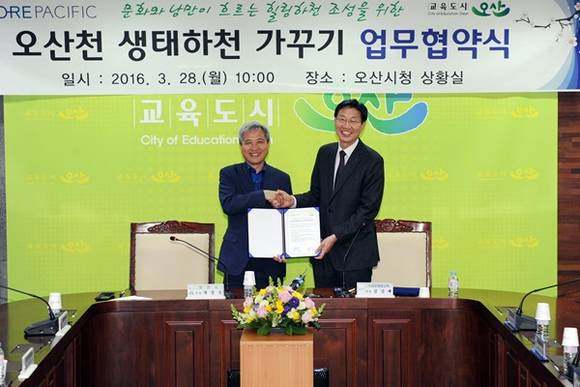 곽상욱 오산시장과 심상배 아모레퍼시픽 사장이 28일 오산천 생태하천 가꾸기 업무협약을 체결하고 오산천을 문화와 낭만이 흐르는 생태 힐링하천으로 가꾸기 위해 적극 협력하기로 했다.