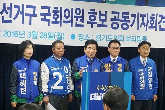 수원시 5개 더불어민주당 국회의원 후보(이찬열, 백혜련, 김영진, 박광온, 김진표)후보가 28일 경기도의회 브리핑룸에서 공동기자회견을 열고 “경제무능 정권을 심판하고 더불어 잘사는 수원을 만들겠다”며 3대 비전을 발표했다.