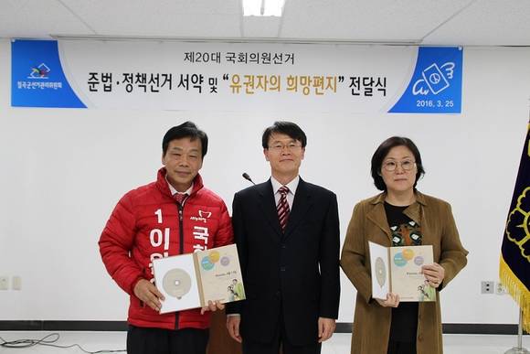 제 20대 총선 경북 고령군·성주군·칠곡군 선거구 새누리당 이완영 후보(現 국회의원, 새누리당 노동위원장)은 25일 칠곡군선거관리위원회가 마련한 ‘준법·정책선거 실천 서약식 및 유권자의 희망편지 전달식’에 참석, 상대후보와 함께 깨끗한 선거를 다짐하는 서약을 맺었다.