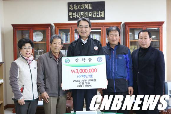▲인제군 인제읍 원대리 자작나무 마을 주민 일동(이장 조남명)은 28일 인제군청을 방문해 지역인재 양성을 위해 써 달라며 장학금 300만원을 기탁했다.(사진=인제군청 제공)