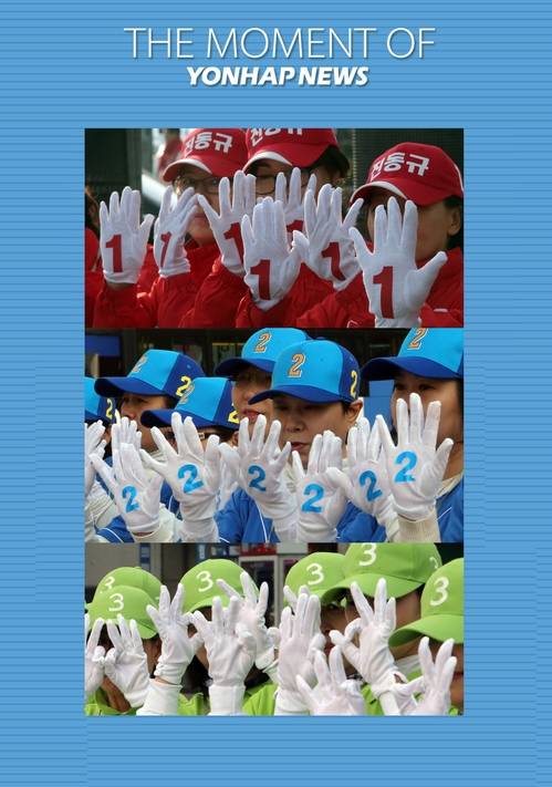 ▲4.13 총선 공식 선거운동 첫날인 31일 오전, 각각 새누리당 후보 선거운동원, 더불어민주당 후보 선거운동원, 국민의당 후보 선거운동원들(위로부터)이 대전 유성구 궁동네거리, 유성온천역 네거리, 충남대정문 오거리에서 지지를 호소하고 있다. (사진=연합뉴스)