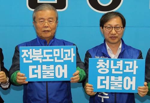▲더불어민주당 김종인 비상대책위 대표(왼쪽)가 1일 오전 전북 전주 덕진구 김성주 후보(오른쪽) 선거사무소에서 열린 중앙당선거대책위원회의에서 전북 국회의원 후보자들과 구호를 외치고 있다.(전주=연합뉴스)