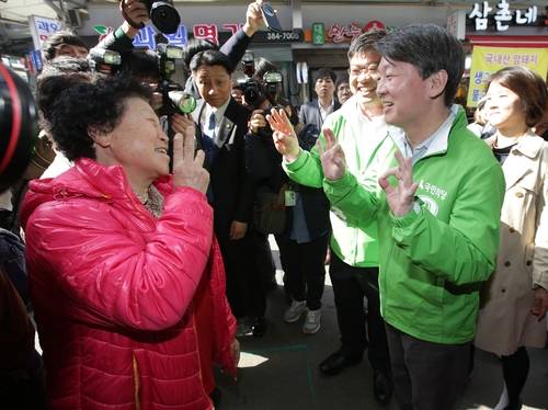 ▲국민의당 안철수 대표가 1일 오전 안양시 관양시장에서 동안구갑에 출마한 백종주 후보 지원유세를 하며 시민들에게 지지를 호소하고 있다.(안양=연합뉴스)